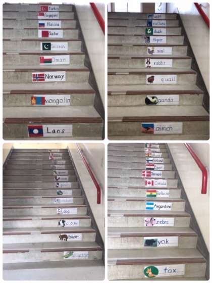 他にも英語が掲示されているところもあります。動物や国の名前などです。探してみて、読んでみて、意味も覚えてみましょう!