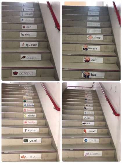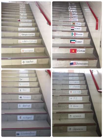 今週からイングリッシュウィークが始まっています。実はその準備として、高学年が協力して、掲示物を作成していたのです。それを、2号階段と3号階段に掲示しています。