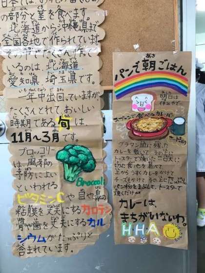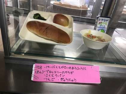 鶏肉と野菜の洋風煮、ブロッコリーのサラダ、黒糖パン、りんご、牛乳