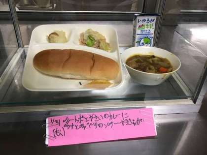 ミートボールと野菜のカレー煮、ツナとキャベツのソテー、焼きじゃか、パン、牛乳