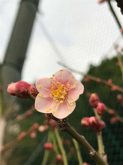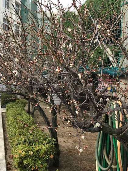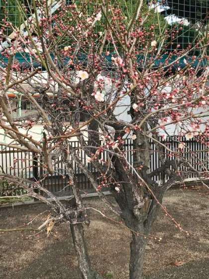 ここ数日、寒い日と暖かい日が繰り返していましたが、プロムナードの梅が開き始めました。