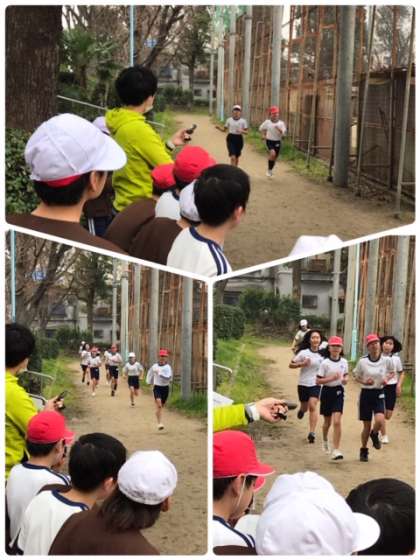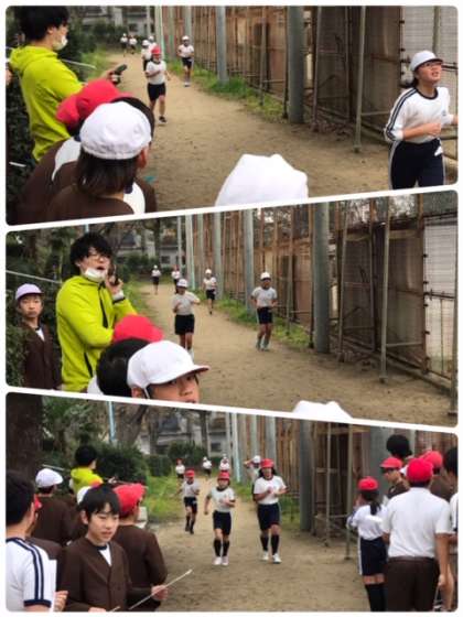 中央公園の外周を使って、6年生がタイムを計っています。記録を取る子どもからは激励の言葉がとんでいました。