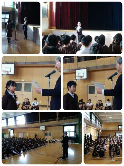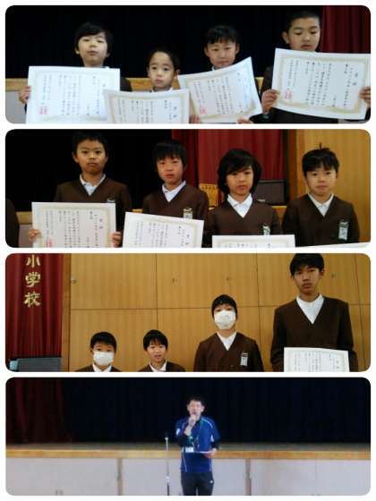 次に、同じく校長先生から昨日エルモ西淀川で行われた「伝えよう!いのちのつながり作文入選作品表彰式」のお話と改めて本校でも表彰をしていただきました。