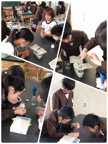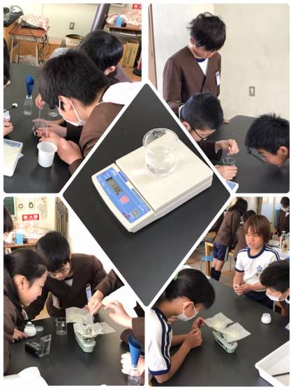 今日の2・3時間目を使って、5年生は各クラスで理科の実験をしました。水にものをとかす前と後では、重さは変わるのだろうかという学習課題のもと、グループで実験結果の予想をしたり、実験の計画を立てたりしながら意欲的に取り組みました。
