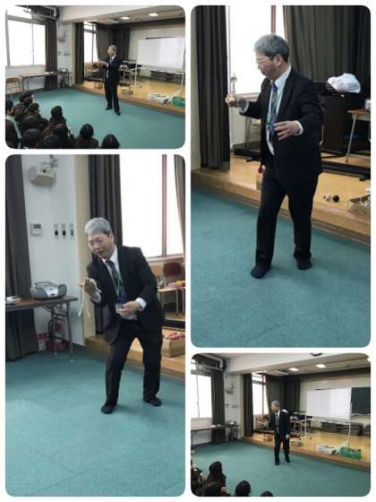 特別講師として校長先生にも、けん玉やこままわしについて教えていただきました。