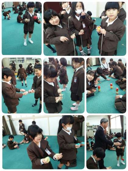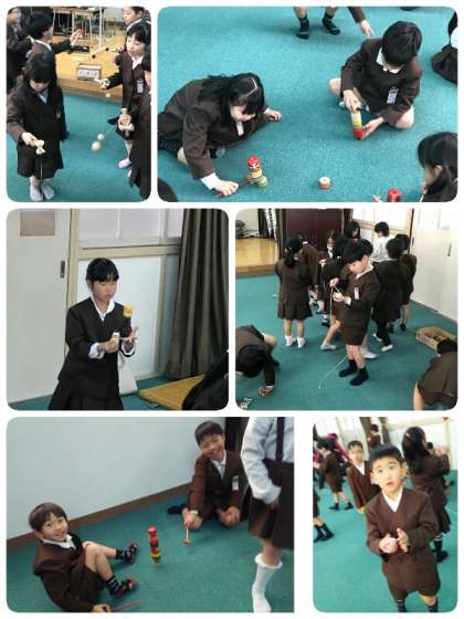 5時間目に、1年生は学年合同で生活科の昔遊びをしました。