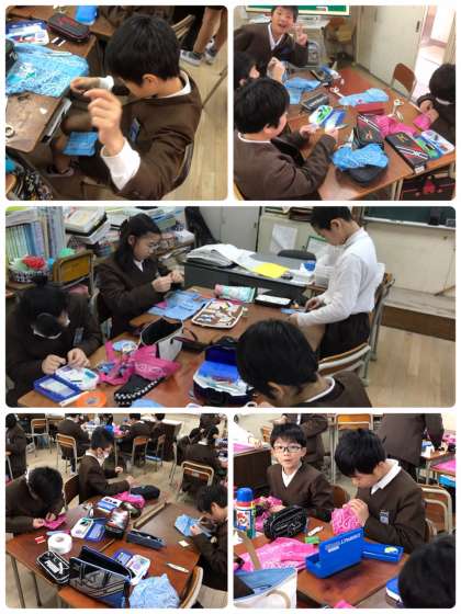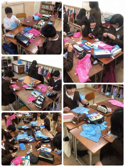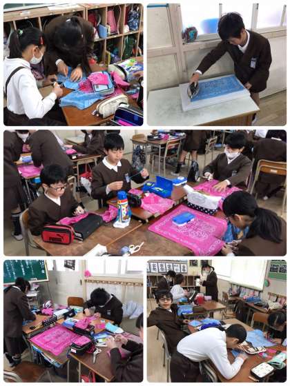 バンダナを縫ってコースターにリメークするという学習課題のもと、5年生は1人1人、習ったことを生かしながら工夫して限られた時間内で完成させました。