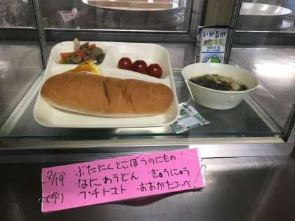 なにわうどん、豚肉とゴボウの煮物、プチトマト、大型コッペ、牛乳