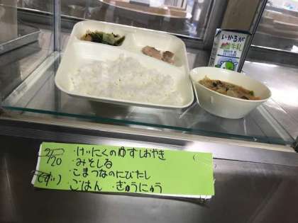 鶏肉の柚子塩焼き、味噌汁、小松菜のにびたし、ご飯、牛乳