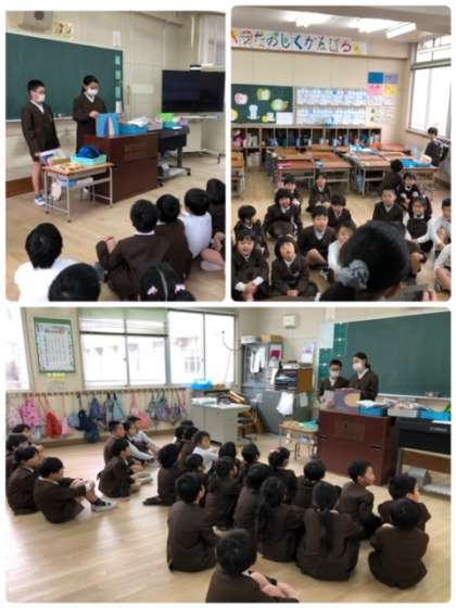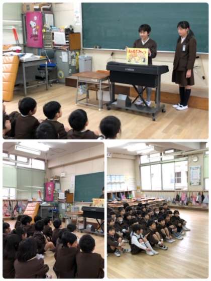 今週、来週は図書委員会の読み聞かせの日です。5、6年生の図書委員会の児童が、それぞれのクラスで上手に紙芝居を読んでいます。