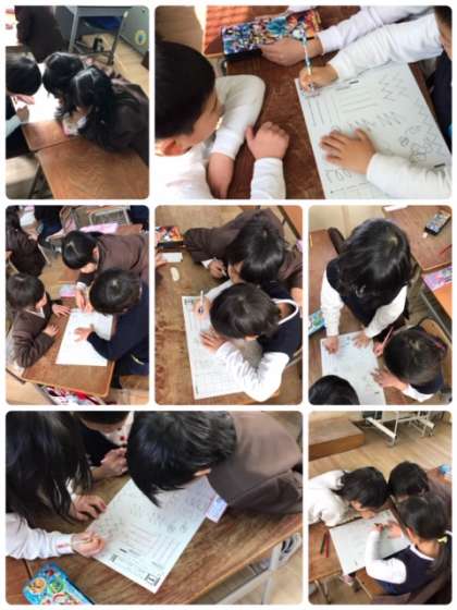 3時間目は、1年1組と教室で交流しました。ランドセルを担いでみたり、プリントを使って書いてみたりしました。1年生がしっかり優しく丁寧に教えていました。幼稚園児さんたちは、最後に丸つけをしてもらって、とてもうれしそうでした。1年生の成長が強く感じられた2日間でした。