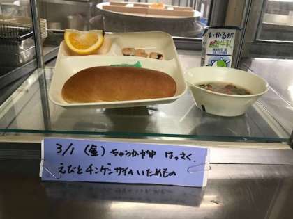中華がゆ、海老とチンゲンサイの炒め物、はっさく、パン、牛乳