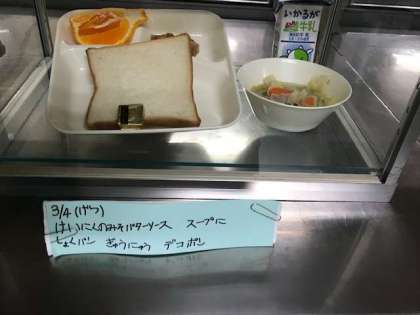 鶏肉の味噌バターソース、スープ煮、デコポン、食パン、牛乳