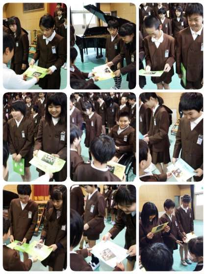 各学年の発表の後は、たてわり班で作った感謝のメッセージカードを代表の1年生から班長や副班長の6年生にプレゼンしました。