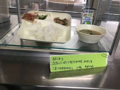 豚肉のゴマだれ焼き、味噌汁、小松菜のおひたし、ご飯、牛乳