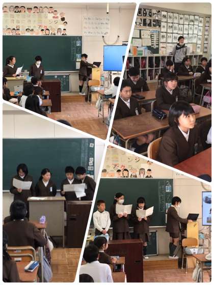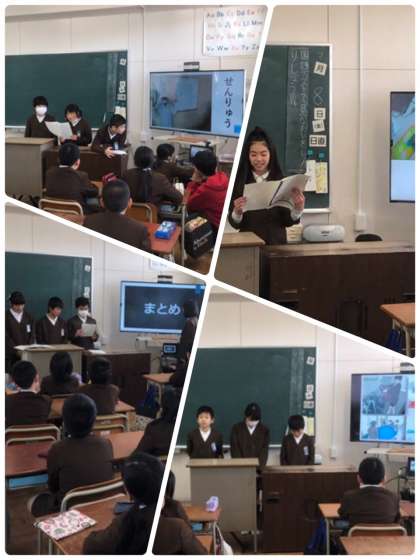 5時間目に、4、5年生が異学年交流をしました。今回は、来年度高学年として、委員会活動をともにする今の4年生に、5年生が委員会活動の1年間の活動報告を行いました。