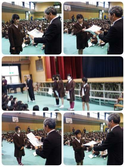 次に5・6年が出品しました国際平和ポスターの表彰がありました。本校からは、4名の児童が優良賞の表彰を受けました。