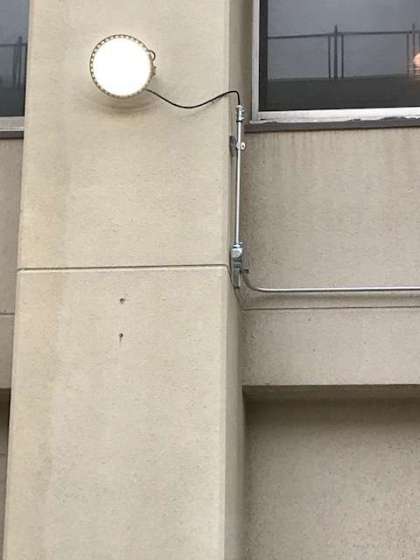 朝礼でも紹介しましたが、中庭に投光器がつきました。これで、もしもの時、中庭に停電さえしていなければ、あかりを灯すことができます。LEDなので明るいです。