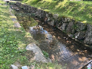 今から、小川で魚つかみをします。気温は、大阪とあまり変わりませんが、木陰に入ると涼しい風が通ります。