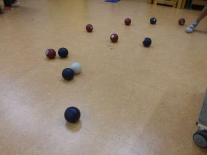 各校の代表あいさつのあと、グループに分かれて「ボッチャ」をしました。「ボッチャ(今回のルール)」は、赤・青の自球を転がして、白球(目標球)に自分たちのボールをいかに近づけるかを競うゲームです。小学部の皆さんとチームを作り、力を合わせて頑張りました。交流会を終えるころには「とても楽しかった」「また小学部の皆さんと遊びたい」と感想を話していました。