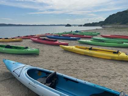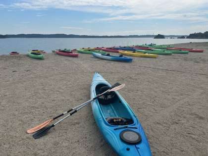 シーカヤック体験が始まりました。真剣な表情でインストラクターの方の話を聞いています。今から2人1組になって海に出ます。