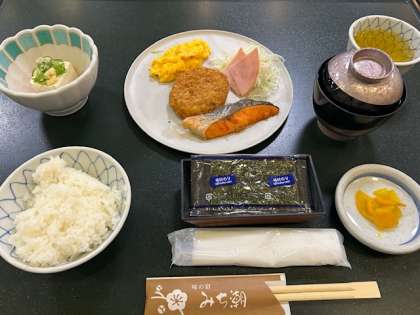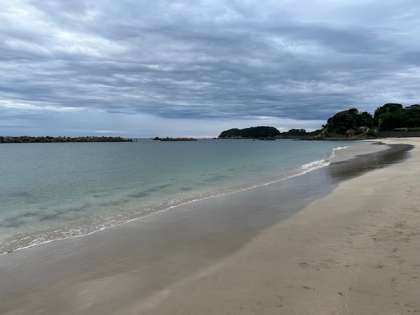 旅館のすぐ裏の海岸で、朝のつどいをしました。穏やかな波です。少し浜遊びもしました。雲の間から晴れ間も見え、明るくなってきました。