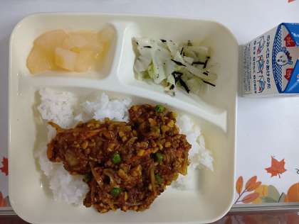 今日の大豆入りキーマカレーライスには、鉄分が摂れるようにチップ状の豚レバーが使われています。