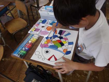 「にじいろのさかな」では、水彩絵の具の使い方を学習します。水の量を調節したり、色を混ぜたりしながら、いろいろな色をつくりました。一人ひとりの個性が光る、素敵な作品ができました。