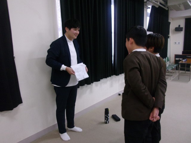 吉本興業より放送作家の先生と漫才師「チャイルドプリンス」の方々にお越しいただき、漫才ワークショップ(漫才授業)を行いました。子どもたちは漫才を通して「表現力」「コミュニケーション能力」を高め、「地域文化(大阪のよさ・笑い)」を学びます。用意していただいた台本をもとに、コンビやトリオでネタを考え、練習しました。ボケやツッコミの仕方、声の大きさなど丁寧に教えていただきました。