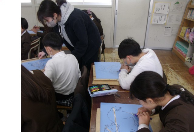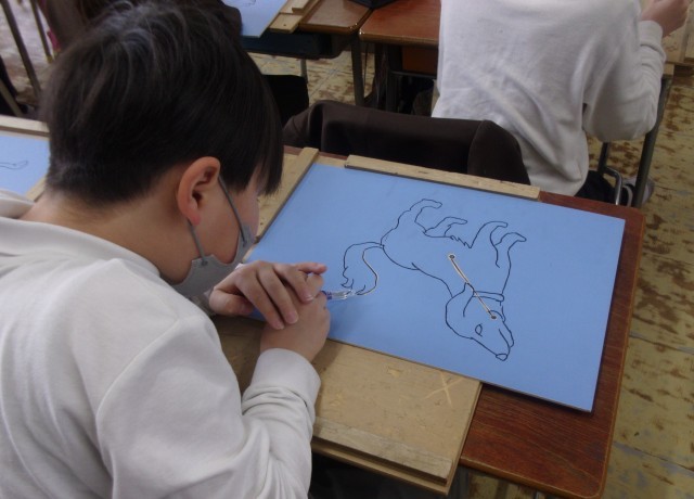持ち方や手の添え方、彫る向きなど彫刻刀の安全な使い方を学習したあと、下絵の線に沿って少しずつ彫り進めています。慎重に、集中して取り組むことができました。