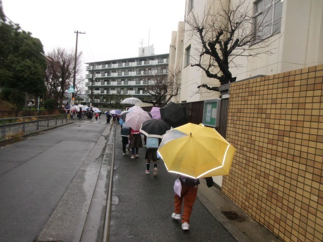今日はあいにくの雨となりましたが、班のみんなで安全に気をつけて集団下校を行いました。