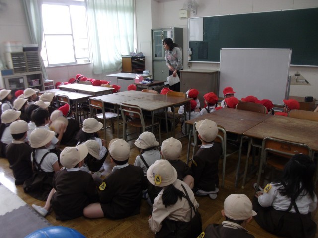 地震、津波を想定した避難訓練を実施しました。訓練放送を聞き、まずは机の下に入って身を守ります。揺れが収まったら、運動場に避難し、その後3階以上の教室へ避難しました。1・2年生は教室が2階にあるため、3階の学習室に入りました。