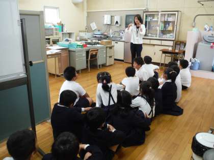 視力検査の様子です。 保健室の先生から、検査の受け方を教えてもらっています。