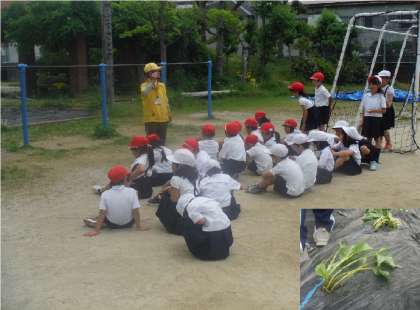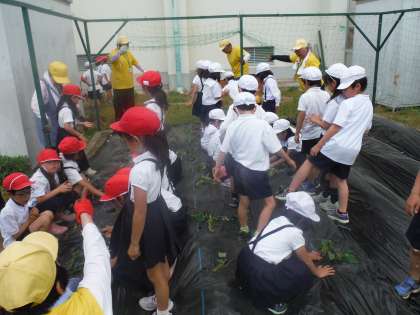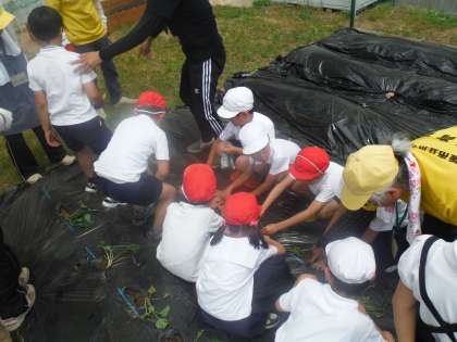 2年生はサツマイモを植えました。 愛育会の方が、児童の待ち時間にも指導支援をしてくださっています。