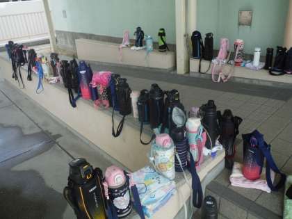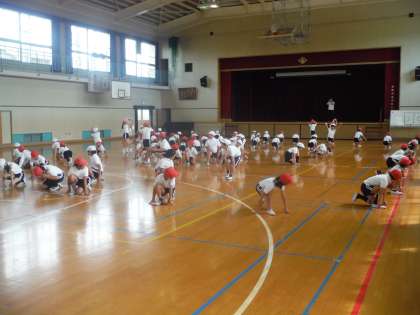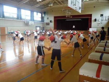 3年生の体育です。 近くに水筒を用意して、ダンスの練習に励んでいます。