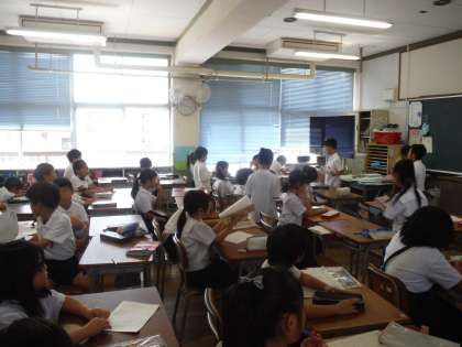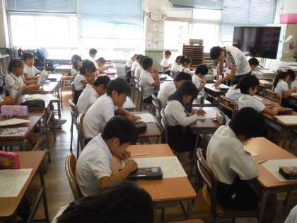 3年生は、係の児童が返却物を届けているところでした。もう一方は算数のテストをしているところです。