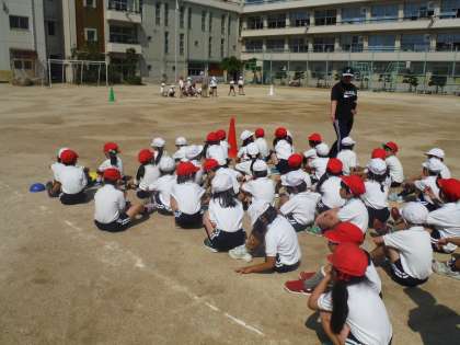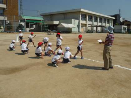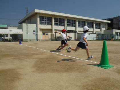 1年生が、かけっこ(徒競走)の練習をしていました。ゴールまでの直線を一生懸命走ります。走り終わった後もきちんと並んで待てました。