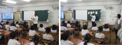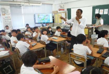 テニー先生が4年生で英語学習のサポートをしてくださいました。「天気」をテーマにみんなで発音したり、ゲームをしたりしました。