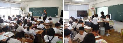 理科で気温の変化について考えています。 右は、国語のワークシートのチェック中です。