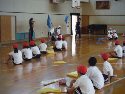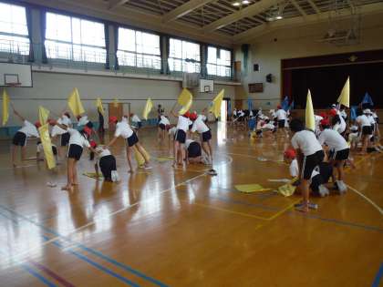運動会団体演技の練習。ポーズをとる時間をそろえる練習です。ポーズの美しさも確認しています