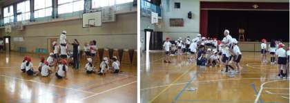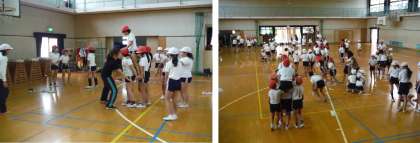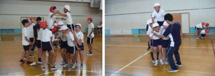 5・6年生:2学年合同で騎馬戦の練習をしています。3人または4人で騎馬を構成しています。