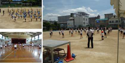 毎時間、どこかの学年が体育をしています。同時に行うときは、ペア学年が運動場と講堂に分かれて取り組みます。