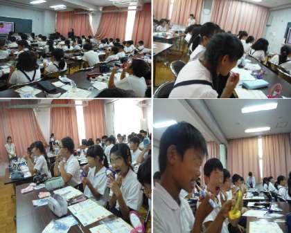 6月4日 全国小学生歯みがき大会 公開日 2019/06/05 更新日 2019/06/05 お知らせ 「プラークコントロールを身につけ、歯と歯ぐき・毎日の健康を保とう!」という主題で、5年生が歯垢の除去と歯肉炎の予防について学びました。DVDに合わせて歯を磨きます。今日学習したことが身について、いつまでも健康な歯でいられたらいいですね。