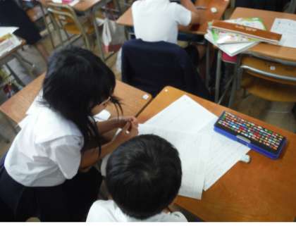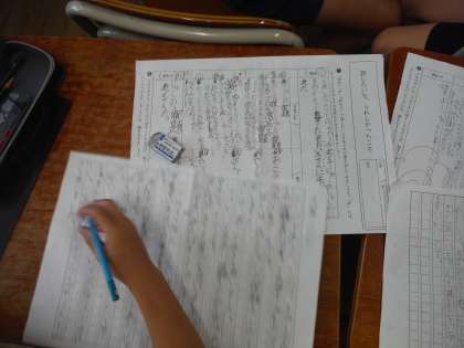 作文学習で「話したいこと」を書きました。近くの友だちとどんなことを書いたか教えあっているようです。