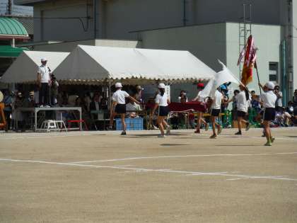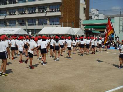 運動会開幕です。 校旗・優勝旗・準優勝カップ・応援旗に続いて、児童が入場します。
