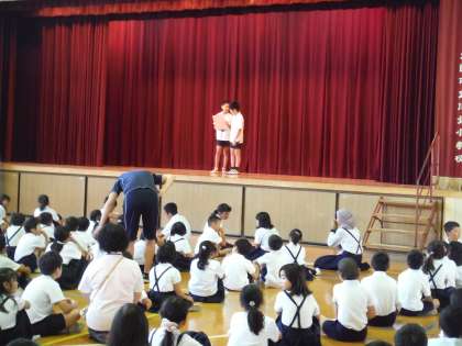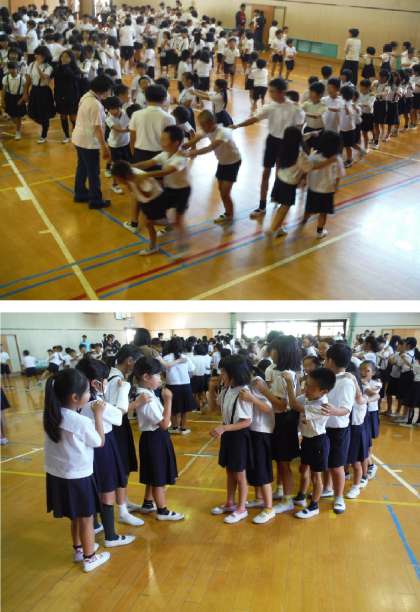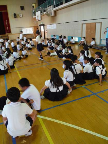 今日のゲームは、「じゃんけん列車」です。じゃんけんをして、負けたら、勝った相手の後ろにつきます。列車はだんだん長くなっていきます。最後に集会委員が、最も長い列車の判定をします。