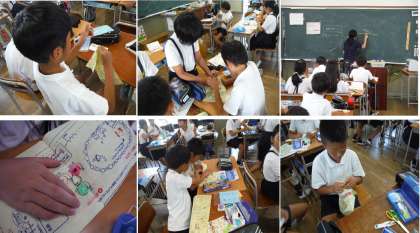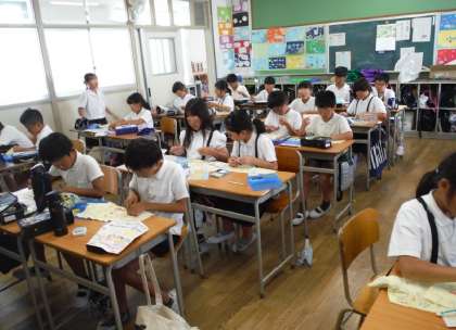 5年生の裁縫実習で、ボタン付けをしているところです。ボタンの縫い付けができたら、友だちの助けに回る様子も見られました。「玉結び」と「玉どめ」は、慣れるまでおうちでも練習させてあげてください。