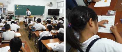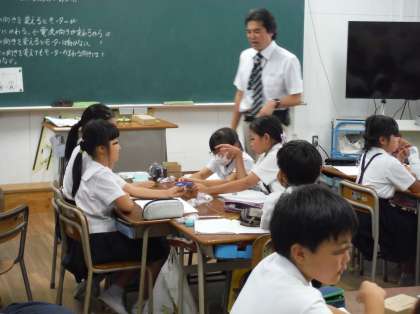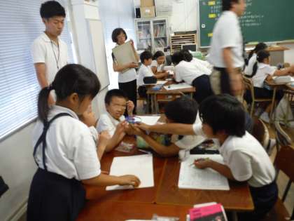 4年生の理科学習です。乾電池とモーターを使って、乾電池の向きとモーターが回る向きの関係性について調べました。