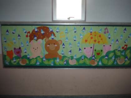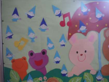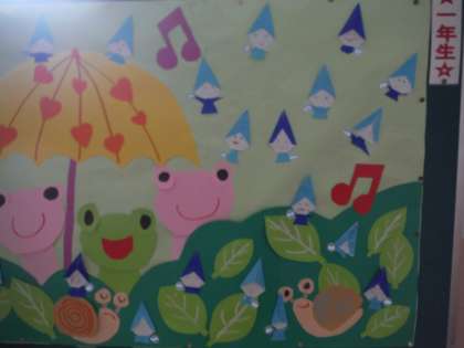 1年生の階段掲示です。折り紙で作った雨つぶが降り注ぎます。