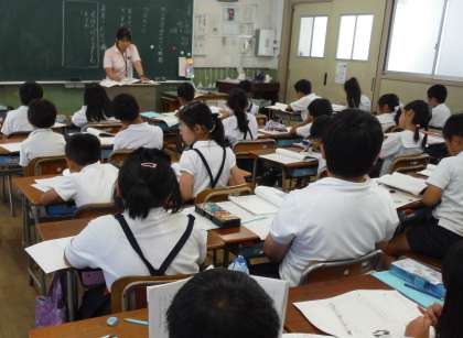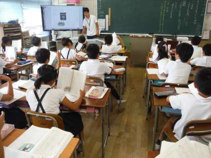 3年生が「ゆうすげ村の小さな旅館」の音読をしています。デジタル教科書には、本文を読み上げてくれる機能も付いています。このような機能も適宜利用します。